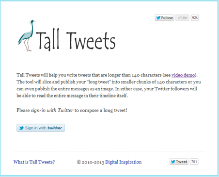 Let’s be honest – there are many times one wishes one had more characters than the allocated 140 to compose a specific tweet. Well, have you heard of Tall Tweets? This is a phenomenal site! Tall Tweets (http://talltweets.com/) is a Twitter app that will help you write tweets that are longer than 140 characters. It can also also publisher longer tweets as images. This exciting app was developed by Amit Agarwal of Digital Inspirations